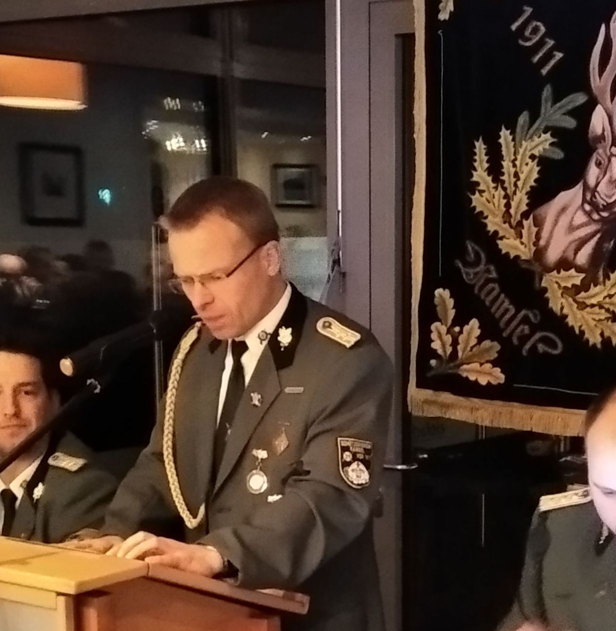 Alle anwesenden Empfänger der Ehrennadeln, goldenen Eicheln, silbernen Eicheln, silbernen Kordeln, grünen Eicheln und grüne Kordeln. (Foto l.)